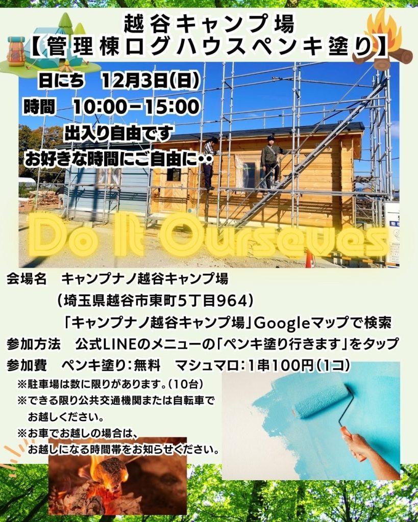 12/3 ログハウスペンキ塗りイベント 2023年12月2日12/3にログハウス作りを、10時から15時頃に予定しております。 事前予約はありませんので、お好きな時間にお越しください。駐車場に限りがありますので、できるだけ電車でのお越しをお願いいたします。なお、キャンプ場はJR武蔵野線吉川駅から徒歩15分程度 中川の水管橋を渡って非日常を感じていただけるルートとなっております。 URL Copied!